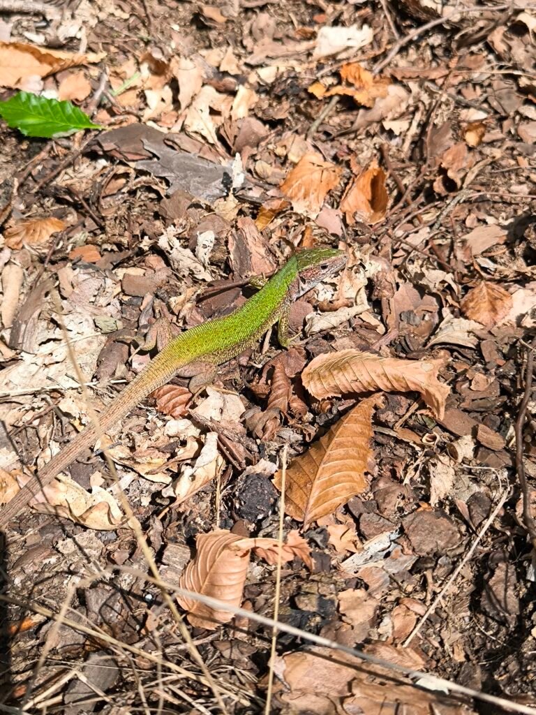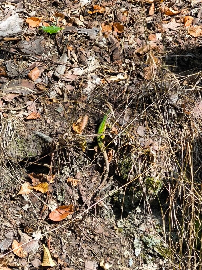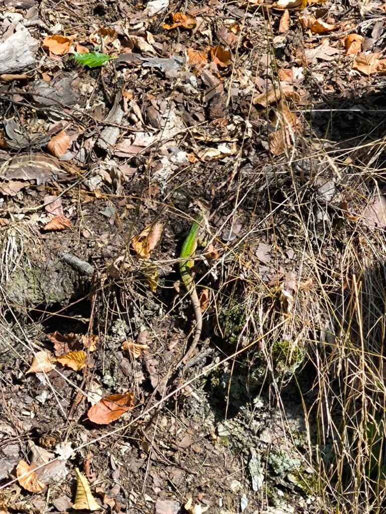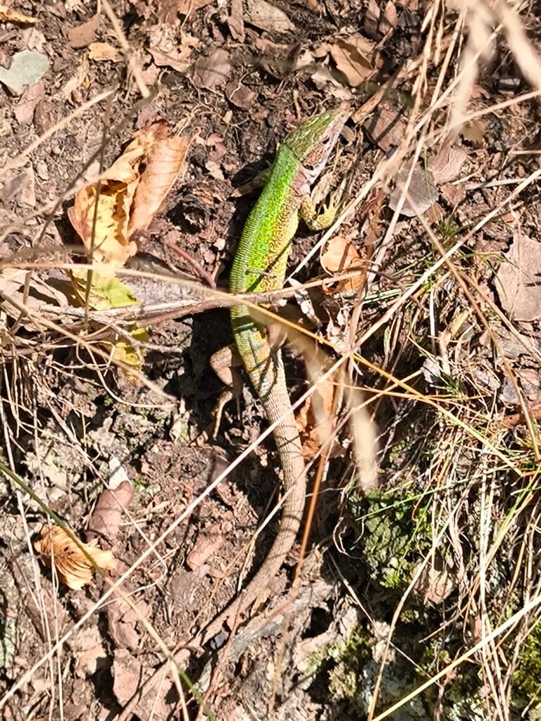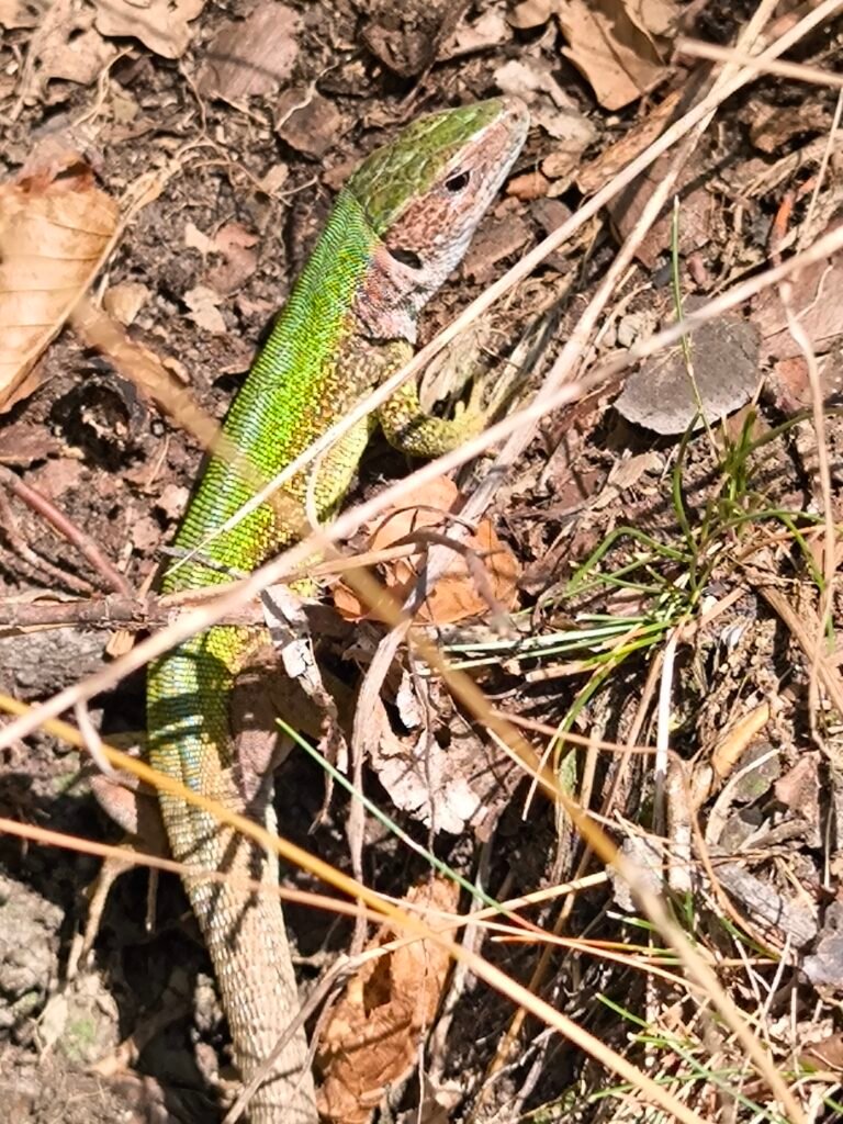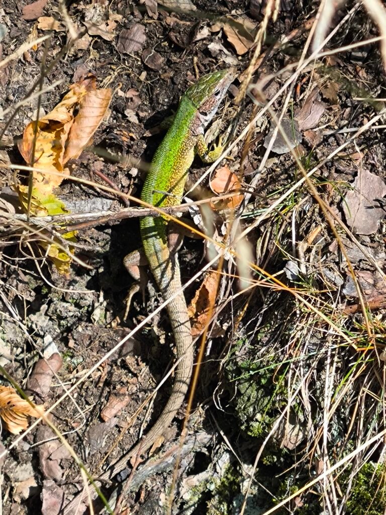 Ještěrka zelená je naší největší ještěrkou. Na křivoklátských skalách se s ní můžeme leckde potkat. Ještěrky mají rády prostředí, kde mohou často i během dne měnit svoji pozici na místech kde je teplo a svítí slunce nebo naopak ve stínu a úkrytu před predátory. Ještěrky jsou loveny ptáky, ale i menšími savci, a proto se musí mít stále na pozoru. Nejlépe jsou chráněny tam, kde mají dost úkrytů a zároveň také dost ploch, kde se mohou vyhřívat a lovit hmyz. Proto největší ohrožení pro ještěrky je ztráta vhodného prostředí, například tím, že skály zarostou hustým křovím nebo stromy a slunná místa zmizí. Pak se někdy vydávají ještěrky za sluncem na ohřáté asfaltové povrchy cest a silnic, kde je však přejedou projíždějící vozidla. Nebezpečím jsou i domácí kočičí miláčci na svých toulkách po okolí, pro které je ulovení ještěrky dobrou zábavou. V okolí Žloukovic najdeme ještěrky v přírodní rezervaci Kabečnice.